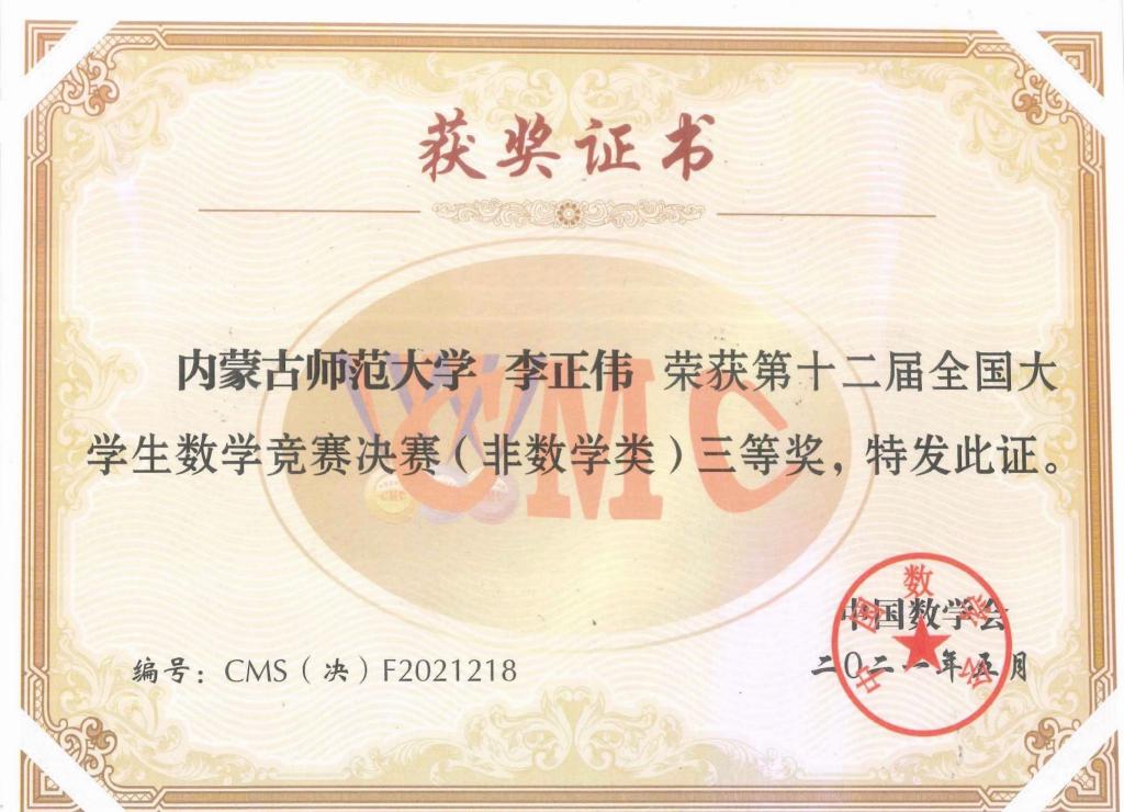 2019级李正伟同学获得了非数学类全国三等奖,实现了我校在该项赛事国奖零的突破。